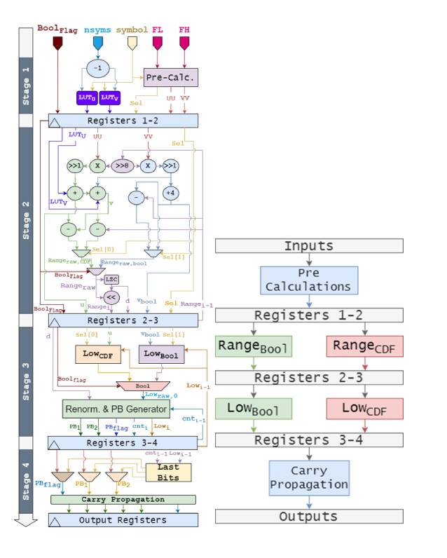 The AE-AV1 , open, royalty-free, encoder implements arithmetic coding as a lossless data compression algorithm that improves upon its predecessor codecs – HEVC, VVC. VP9 etc. It optimizes key variables that depict a numeric interval (Low, Range) to encode incoming symbols into a reduced bitstream based on probabilities of their appearance.