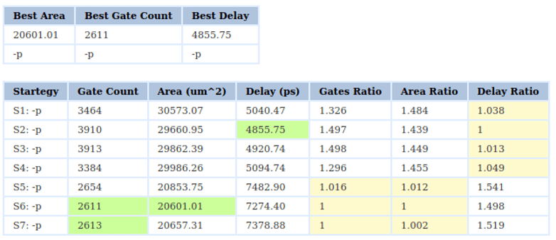 OpenROAD supports design exploration through an OpenLane python script that automatically runs multiple, user-defined experiments based on different synthesis strategies to optimize area and performance. The table below depicts a sample experiment showing different results for the design to optimize gate count, area and the worst path delay for a given process.