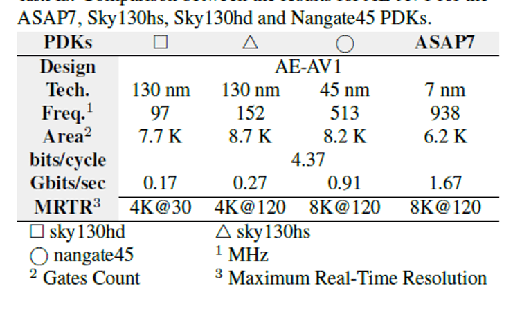 The final design implementation of AE-AV1 using ASAP7 shows a significant improvement in gate count and frequency, over the baseline AV1, with the target MRTR (Maximum-Real-time_Resolution) goal of 8K@120fps, for real-time processing at the maximum possible AV1 resolution. Table below shows the exploration and implementation results across multiple OpenPDKS.