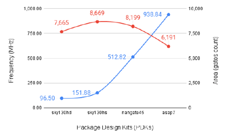 ASAP7 delivered the best PPA, area and frequency improvements to area (24.48%) and frequency ( 82.8%) as compared to the Nangate 45nm PDK. Significant area and performance improvements were possible only at 45nm and lower nodes.