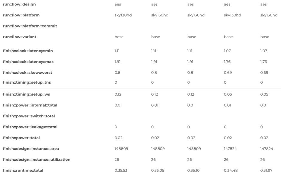 Here’s a screenshot of an OpenROAD internal jenkins dashboard that tracks key flow and design METRICS across multiple CI runs. You can see how these METRICS change across software updates. Note the improvements to clock latency, skew and setup time improvements for this design across the last 3 runs.