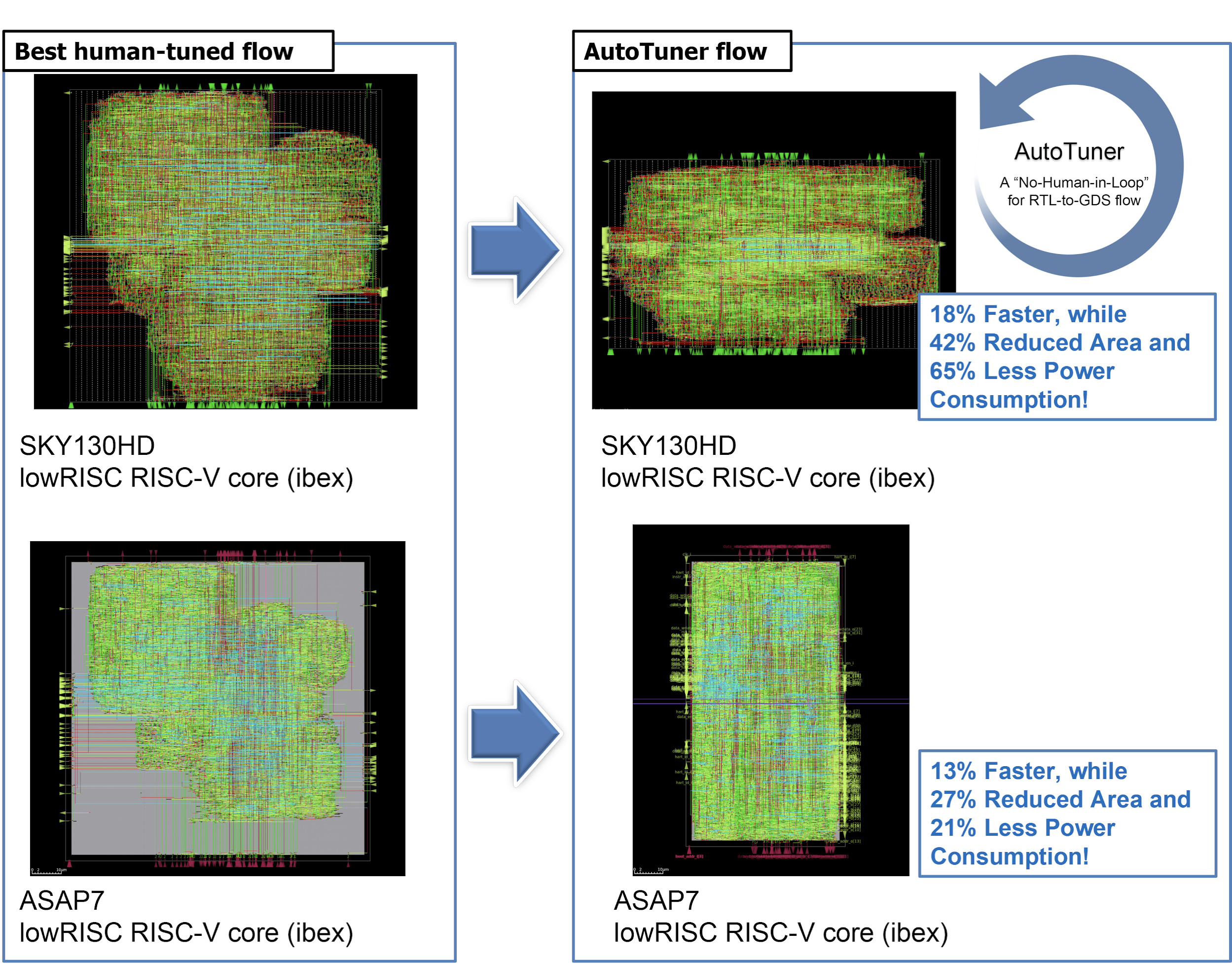 The image below shows results of using an Autotuner based flow vs a custom design for the IBEX core on SKY130HD and ASAP7. Images were generated using OpenROAD GUI.