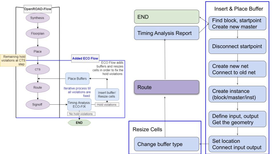A timing-driven ECO flow in OpenLane generates an optimized netlist based on post-route timing checks to fix hold violations. The ECO flow starts from checking the post route report generated by OpenROAD™ and then using a python script to check the report, insert buffers and resize. Inside the ECO loop, the python script, detail placement, global routing and detail routing are called sequentially. The reports are generated each time, and the loop stops until no hold time violations are found.