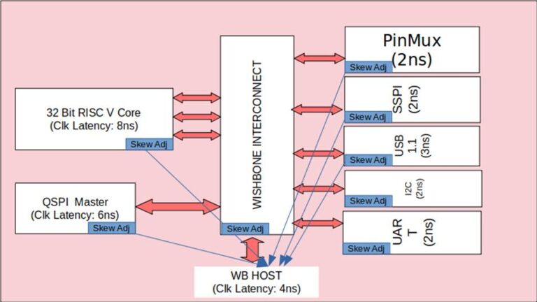 Currently, the OpenLane flow does not automatically balance clock skews across the Macros. Shown below is an example where each Macro has a different clock latency. Dinesh defines each Macro with16-tap adjustable clock skew buffers. Each Macro is hardened with skew adjusted to close timing at the top-level Caravel design.