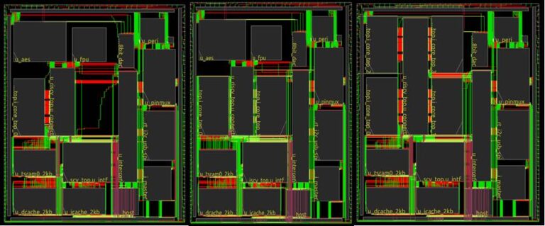Figure below shows the final routed GDSII for the RISCduino Score, Dcore and QCore designs.
