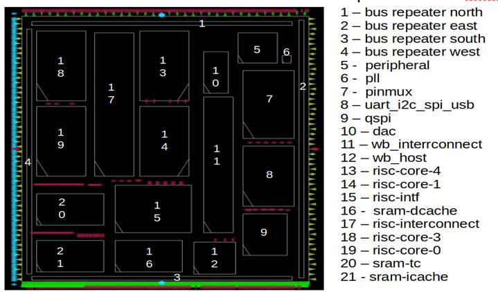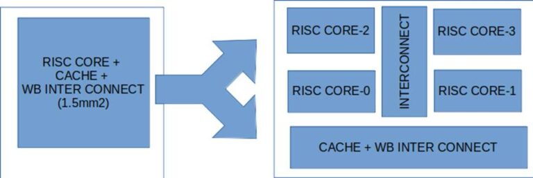 The hierarchical design flow methodology using OpenROADTM and OpenLane significantly reduces runtime and eases design complexity for the target user area die size (10 mm2) and pre-defined pin constraints of the Caravel GPIO. Dinesh implemented three derivatives of the main RISCduino core: single, dual and quad, as shown in the figure below.
