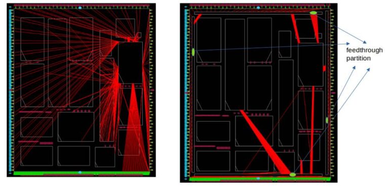 These feedthrough partitions are manually inserted at 4 corners of the design. The partition I/O signals and position are based on the physical location of the corresponding top-level I/O ports and Macro pins. Finally, these partitions are hardened in met-3, so that they do not block global met-4/met-5 PDN stripes. Timing for feedthrough paths is analyzed by extracting the SPEF parasitics of the paths inside the partition and running timing analysis in OpenLane at top-level.